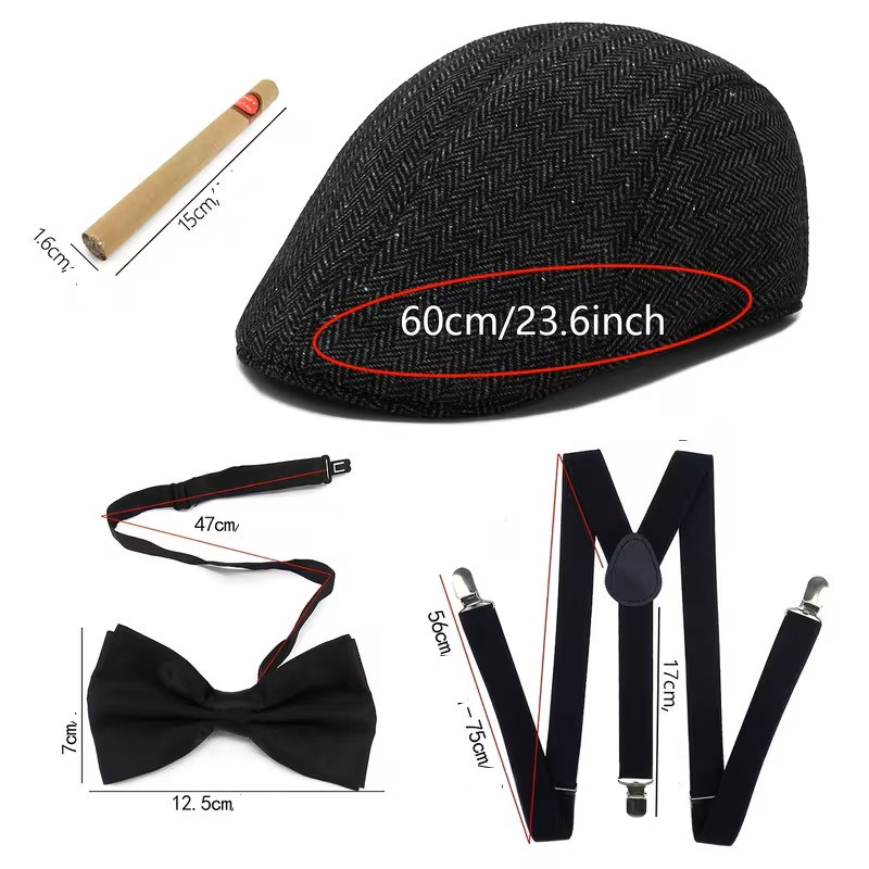 Festpakken fra 1920'er Herre Newsboy Manhattan Hat, Y-Back Seler, Butterfly, Og Cigar Props